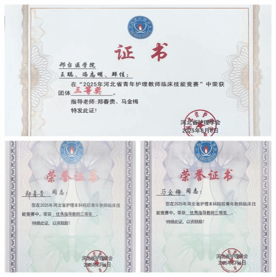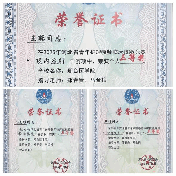 近日,由河北省护理学会主办的2025年河北省青年护理教师临床技能竞赛圆满落幕。beat365官网护理系教师王聪、冯志明及学校第二附属医院肿瘤科鲜佳代表学校参赛,凭借扎实的专业技能和出色的临场发挥,在皮内注射、静脉输液、心肺复苏三个项目中分获三等奖,同时斩获团体三等奖。指导教师郑春贵、马金梅荣获优秀指导教师三等奖。