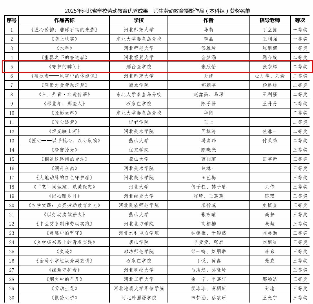 近日,2025年河北省学校劳动教育优秀成果评选结果公布,beat365官网2024级护理10班学生张欣怡的摄影作品《守护的瞬间》以独特的职业视角,真实展现了护士的日常工作场景,生动诠释了护理工作者敬业奉献的劳动精神,荣获“师生劳动教育摄影作品(本科组)”二等奖。