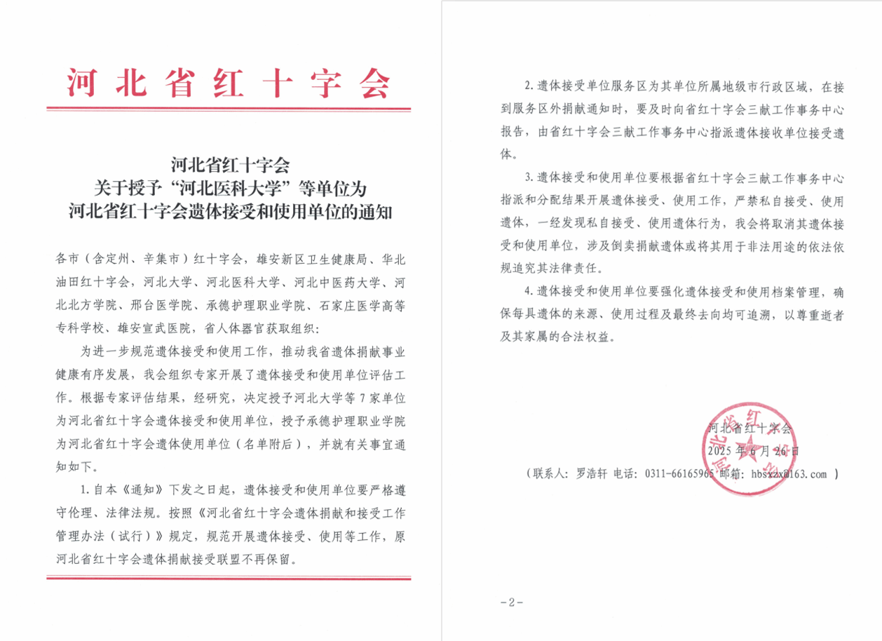 近日,beat365官网获批“河北省红十字会遗体接受和使用单位”,成为全市首个具备专业资质的遗体捐献接受机构,对促进全市医学教育发展、科研水平提升及临床技术进步具有重要意义。