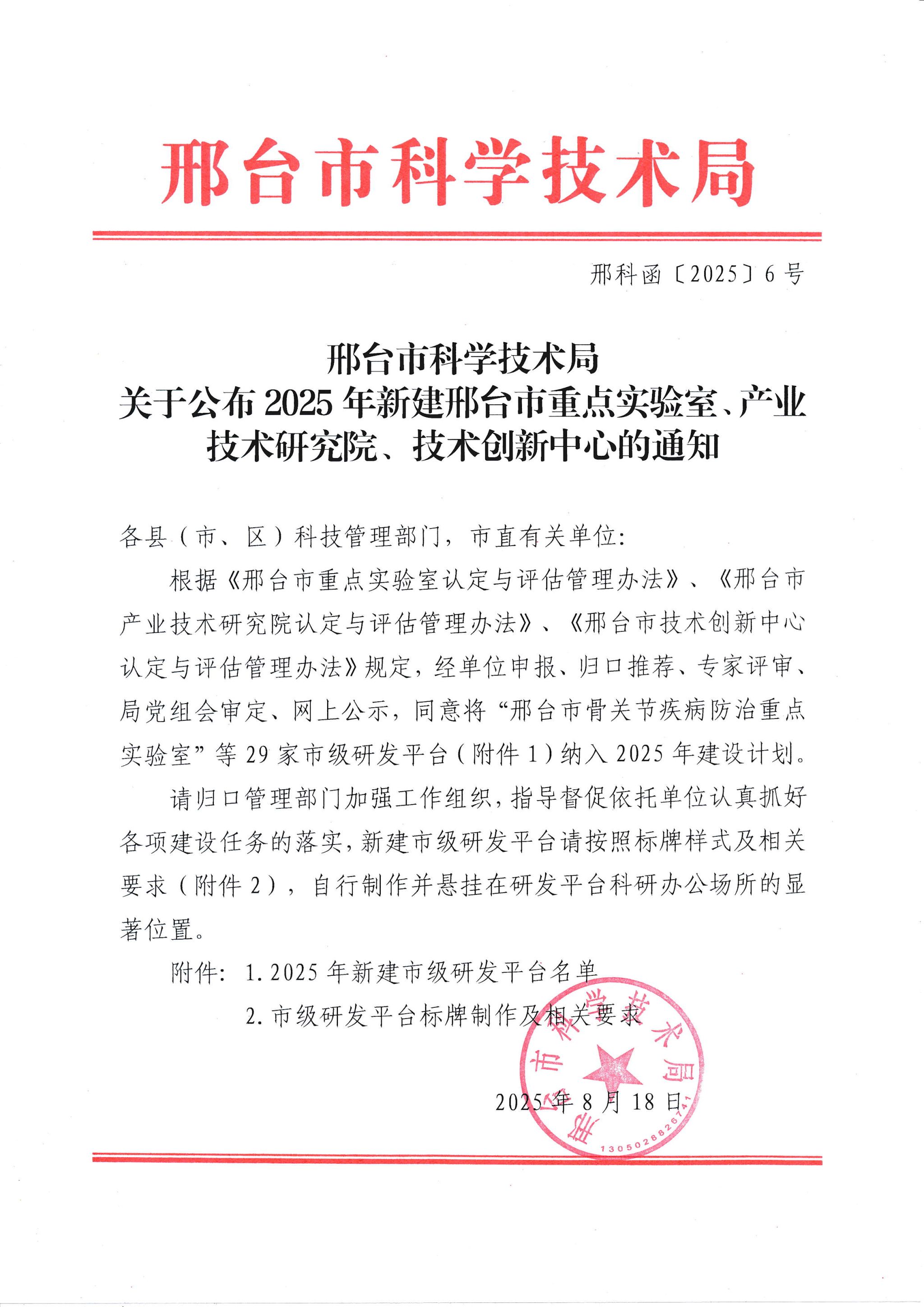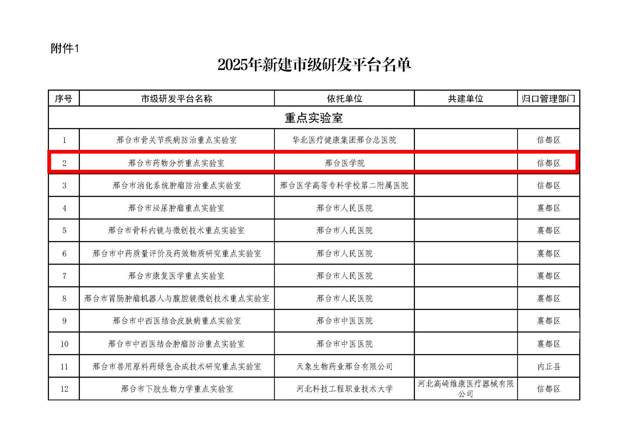 近日,邢台市科技局公布了2025年新建市级研发平台名单,beat365官网药学系“邢台市药物分析重点实验室”入选2025年度邢台市重点实验室,标志着学校在科研平台建设方面取得了新突破。