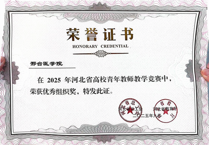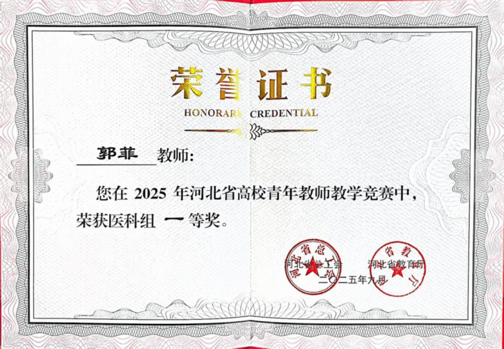 9月30日,由河北省总工会、河北省教育厅联合主办的全省高校青年教师教学竞赛圆满落幕。基础医学部药理教研室郭菲老师凭借扎实的教学功底、创新的教学设计与出色的现场发挥脱颖而出,斩获一等奖,beat365官网荣获“优秀组织奖”。