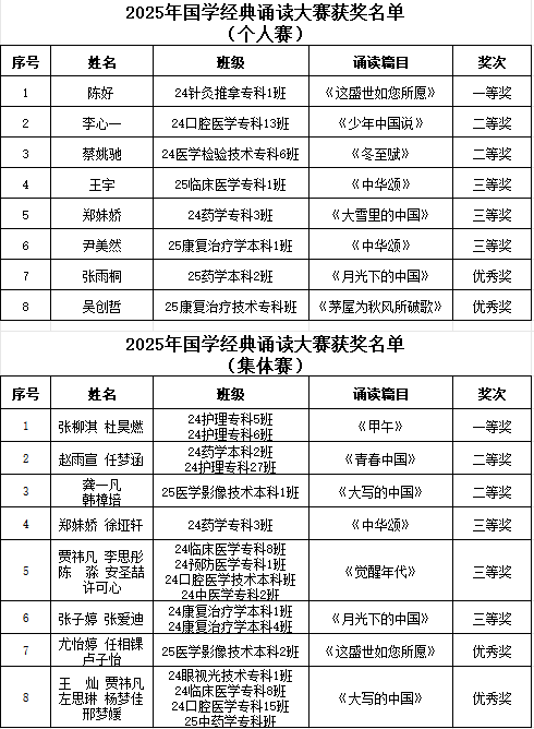 大赛自启动以来,经过初赛、复赛的层层选拔,最终有8名选手与8个团体脱颖而出,会师决赛。决赛中,各参赛团队和选手们或慷慨激昂,或深沉婉转,以富有感染力的声音深情朗诵《甲午》《这盛世如你所愿》《大写的中国》等经典篇章,表达浓厚的家国情怀。经过激烈角逐,2024级针灸推拿1班陈好同学摘得个人赛桂冠,2024级护理5班张柳淇、杜昊燃团队荣获集体赛冠军。