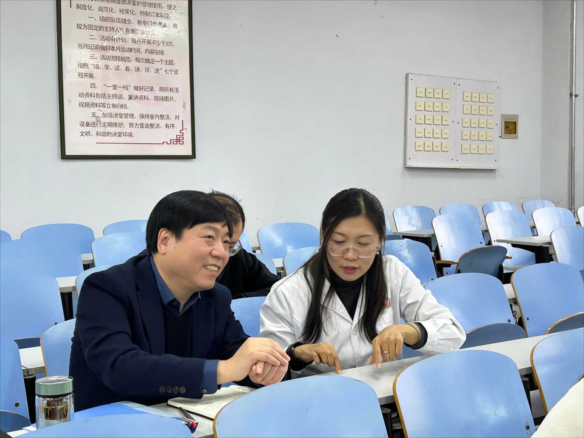 课后,李书记与师生进行了亲切交流,充分肯定了教学效果,从提升思政课教学质量的角度提出了针对性的意见建议:一要重视板书的运用,注重将板书与多媒体教学相结合,突出重点,为学生适应课堂节奏、理清知识逻辑提供抓手;二要理顺案例与知识点之间的内在逻辑关系,精准恰当地对案例进行引申和拓展;三要在思政课程中突出课程思政元素,课堂案例的选取要紧密结合学校性质,充分考虑学生的专业及认知水平,注重引用中外医学典故及案例。