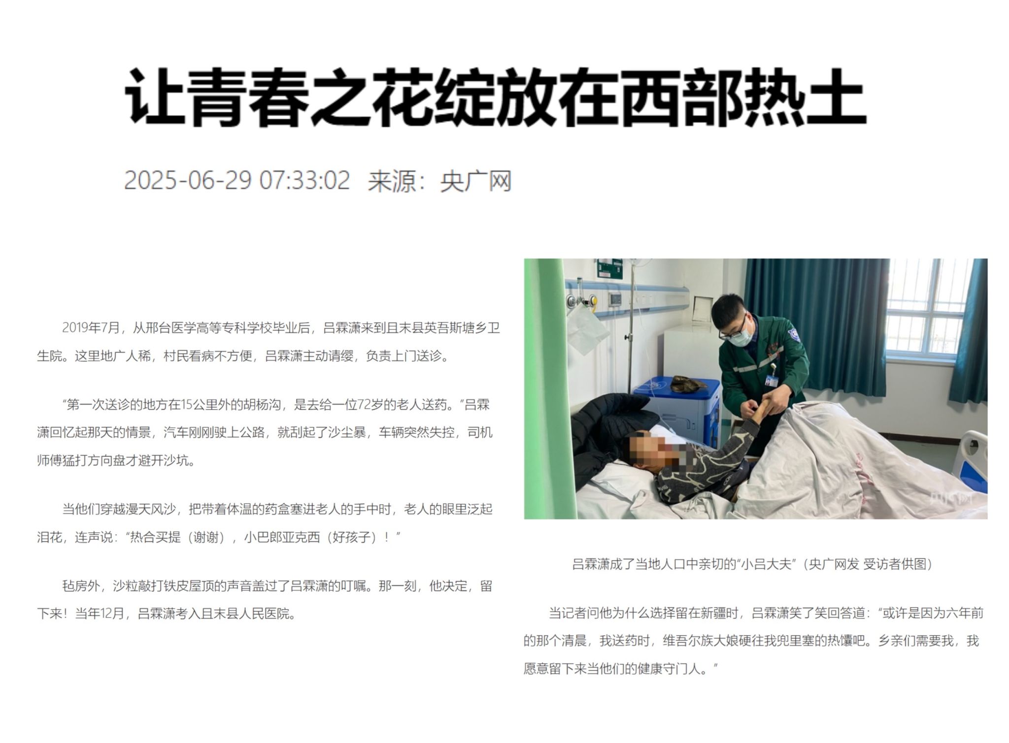 吕霖潇同学在校期间笃志好学,积极上进,思想进步,乐于助人,始终担任班长职务,多次获评“优秀学生干部”“三好学生”,2019年荣获省级“优秀毕业生”。毕业后,他积极投身“大学生西部计划志愿者”项目,始终工作在新疆巴音郭楞州且末县人民医院急诊科一线。他把且末当成自己的第二故乡,常常背着医药箱,迎着沙尘暴,辗转各个乡镇为老乡入户建档,送医送药,为患者垫付应急医药费成为他的“家常便饭”。由于工作突出,他先后获得且末县人民医院“医德医风先进个人”、县“优秀志愿者”等荣誉。他跨越山海、坚守生命的事迹多次在央广网、河北日报、河北省共青团、巴州融媒体中心、且末零距离、西部志愿汇报道。