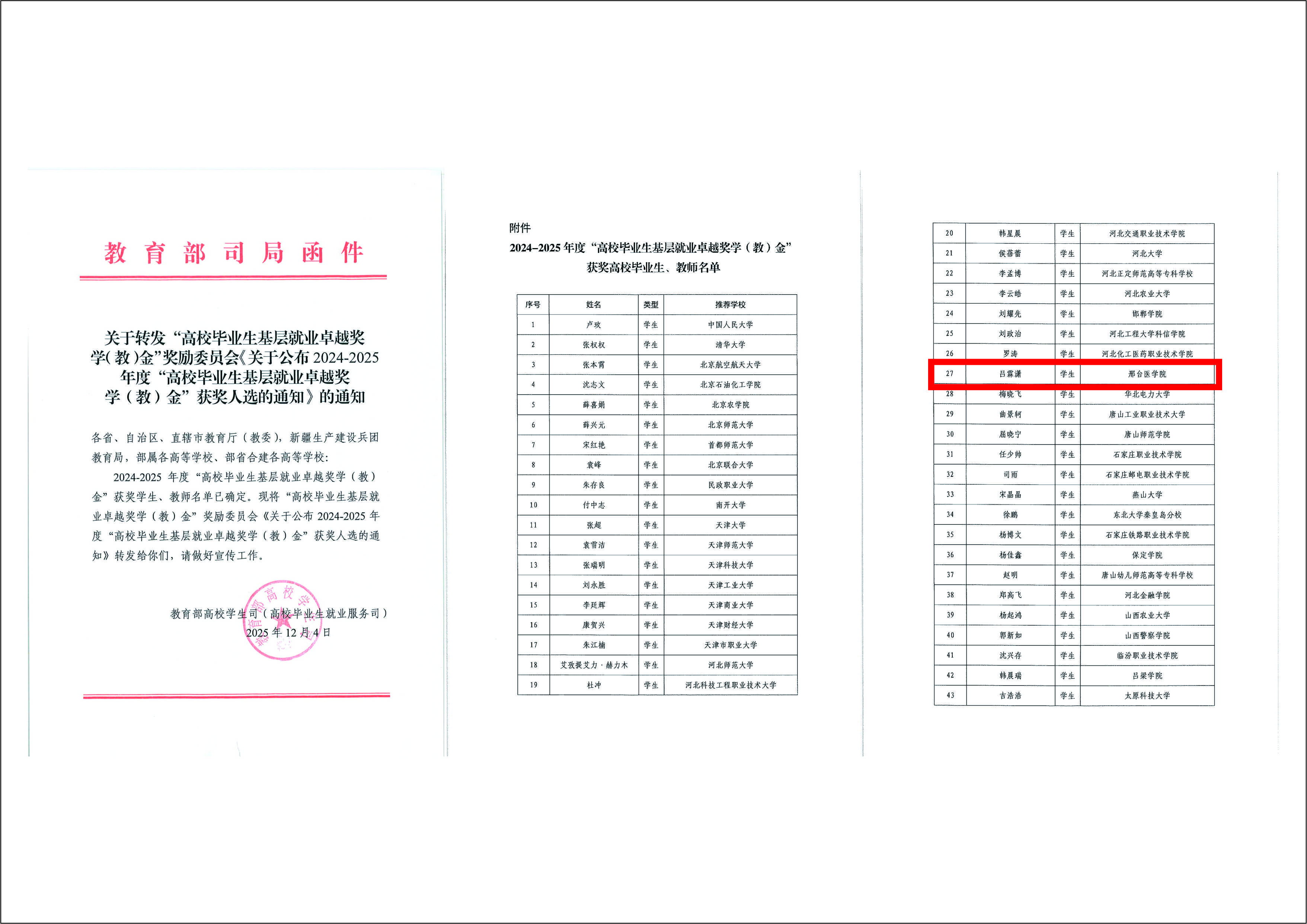 近日,教育部公布了2024-2025年度“高校毕业生基层就业卓越奖学(教)金”获奖人选,beat365官网2019届临床医学专业毕业生吕霖潇入选。本年度全国共表彰418名毕业生,其中河北省仅21名毕业生获此殊荣。