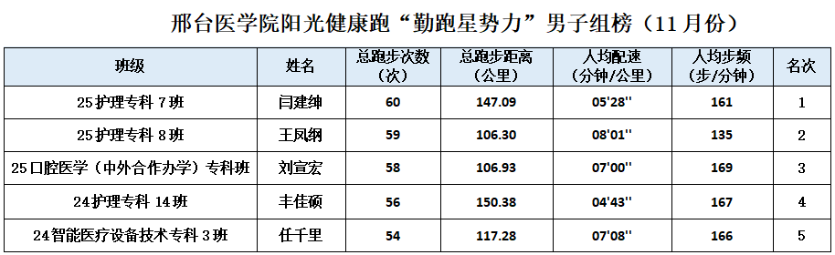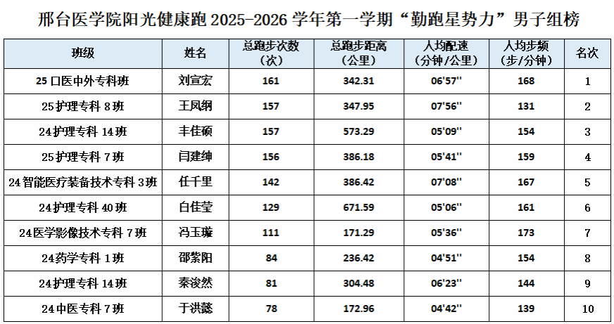 2025级口医中外专科班刘宣宏同学是本学期男子组第一名,他坦言,跑步不仅是一项运动,更是一种生活方式,跑步让他告别熬夜,大大提高了学习效率。