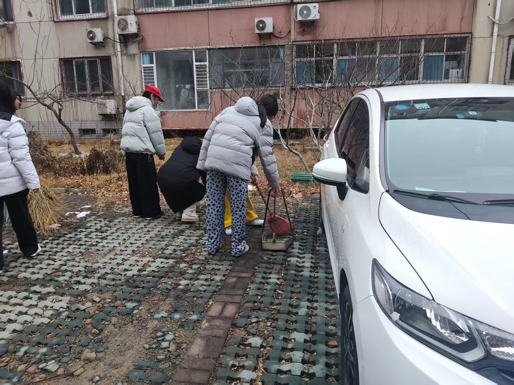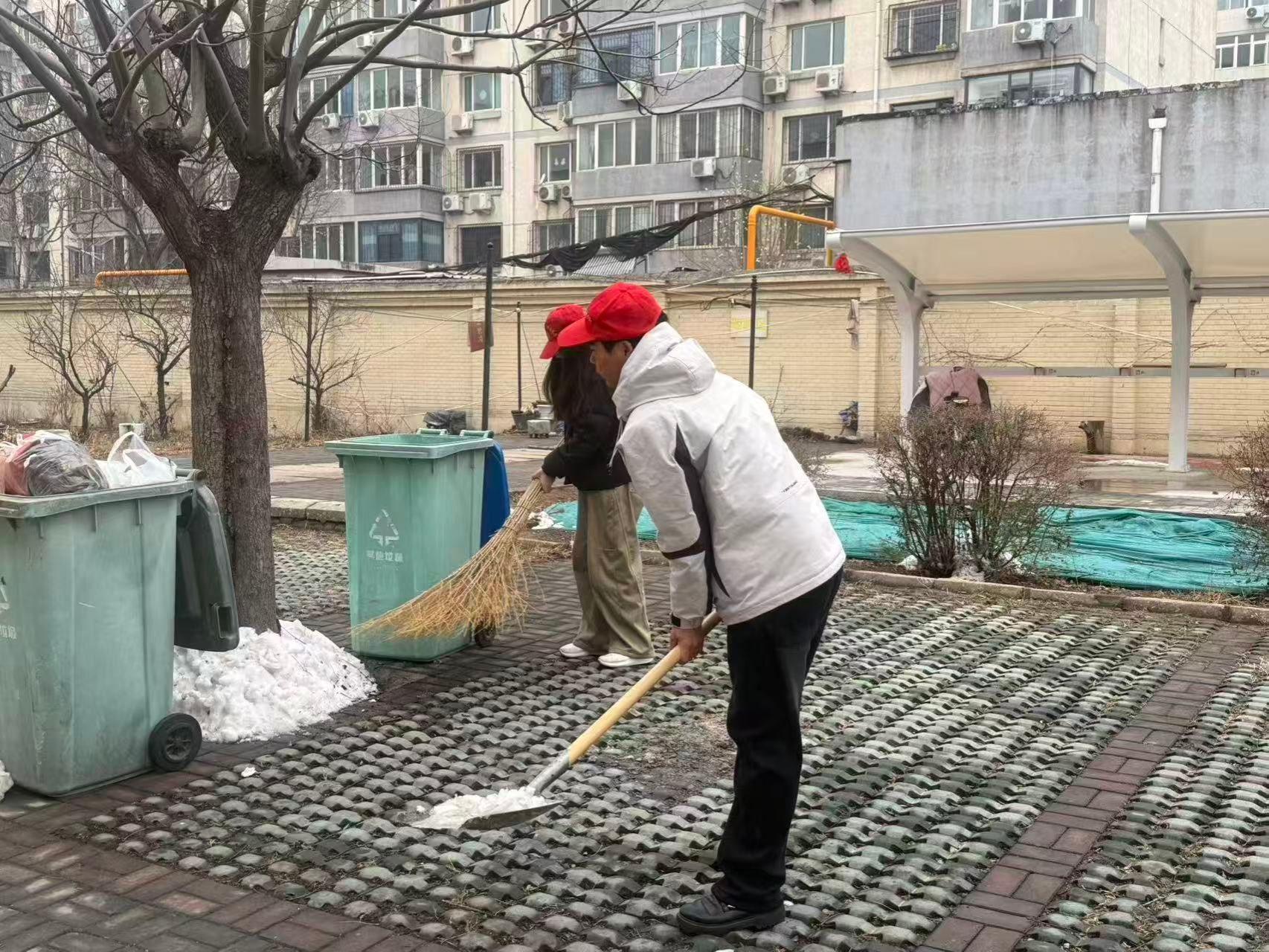 中医系爱心互助社组织 15 名志愿者前往石安高速小区开展志愿服务活动。志愿者们不畏严寒、手持铁锹等工具,对小区内的积雪进行全面清理,并及时清扫路面垃圾、规整环境秩序,用实际行动改善社区居住环境。