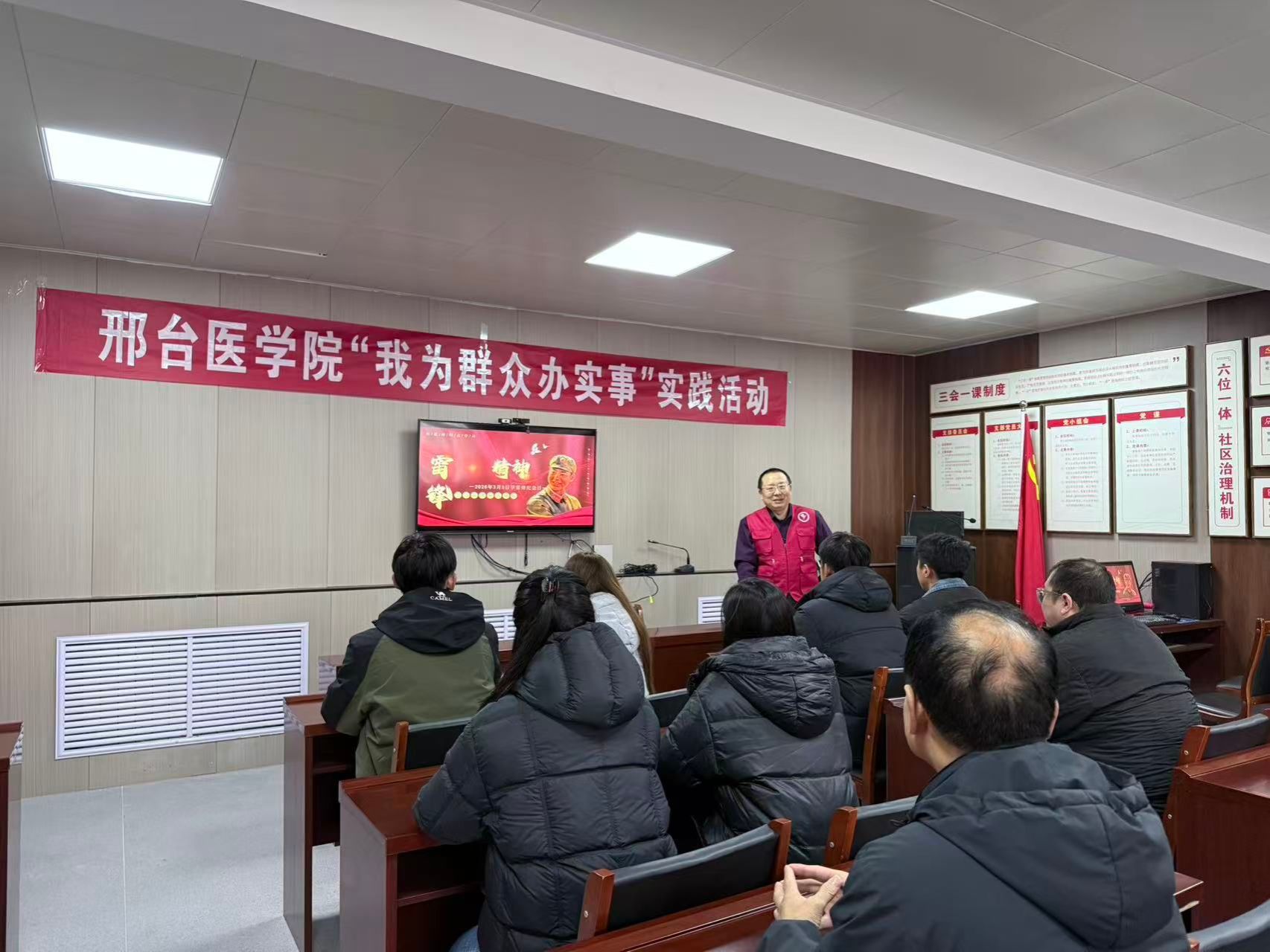 马克思主义学院军事理论教研室主任李峰结合身边鲜活的雷锋故事,深入浅出地解读了雷锋精神的丰富内涵与时代价值,他讲道,雷锋精神体现在为民服务的一件件小事之中,是中国式现代化进程中不可或缺的精神力量,他号召大家把雷锋精神融入日常、化作经常,在邻里守望、互帮互助中传递温暖。宣讲贴近生活、贴近群众,30余名居民参加,现场氛围温暖而活跃。