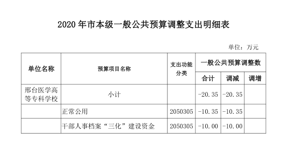 邢台市十五届人大常委会第三十一次会议审议通过了市本级预算调整方案,财政批复了部门预算调整事项,现将我部门及下属单位预算调整情况予以公开,具体事项详见下表: