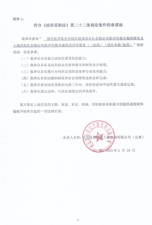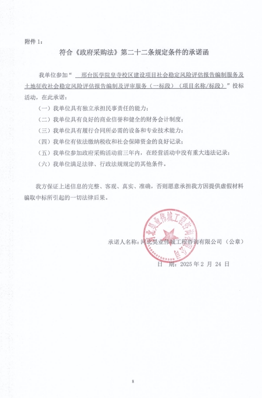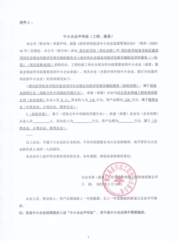 河北昊业伟城工程咨询有限公司 | beat365平台唯一官网皇寺校区建设项目社会稳定风险评估报告编制服务及土地征收社会稳定风险评估报告编制及评审服务一标段 | beat365平台唯一官网皇寺校区建设项目社会稳定风险评估报告编制服务;完成beat365平台唯一官网皇寺校区建设项目502亩及108亩用地社会稳定风险评估报告编制工作并配合采购人报相关行政部门审批,取得相关行政部门的备案。 | 合格,符合国家或行业现行标准要求 | 合格,符合国家或行业现行标准要求 | 同签订后7日历天内完成,具体以配合beat365平台唯一官网取得稳评主管部门的备案为止。 | 97950元 |