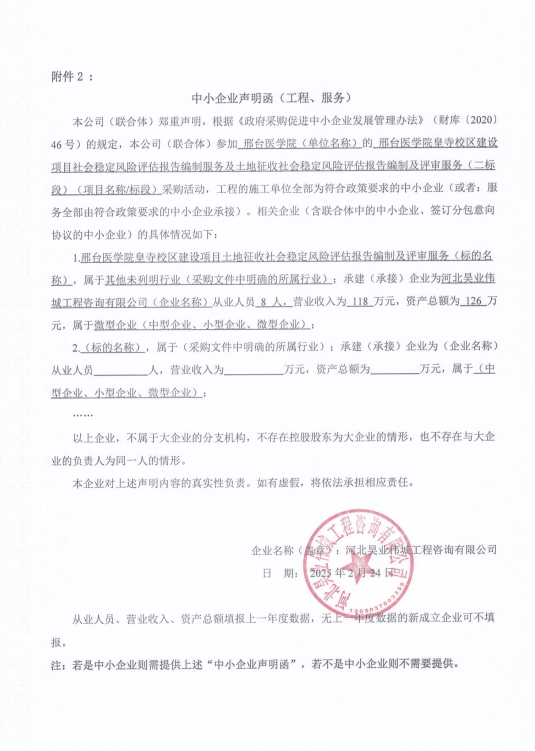 河北昊业伟城工程咨询有限公司 | beat365平台唯一官网皇寺校区建设项目社会稳定风险评估报告编制服务及土地征收社会稳定风险评估报告编制及评审服务二标段 | beat365平台唯一官网皇寺校区建设项目土地征收社会稳定风险评估报告编制及评审服务;完成beat365平台唯一官网皇寺校区建设项目502亩及108亩用地的土地征收社会稳定风险评估报告编制及评审服务,满足相关行政审批部门要求及征地组卷、建设用地报批需求。 | 合格,符合国家或行业现行标准要求 | 合格,符合国家或行业现行标准要求 | 合同签订后3日历天内完成 | 116000元 |