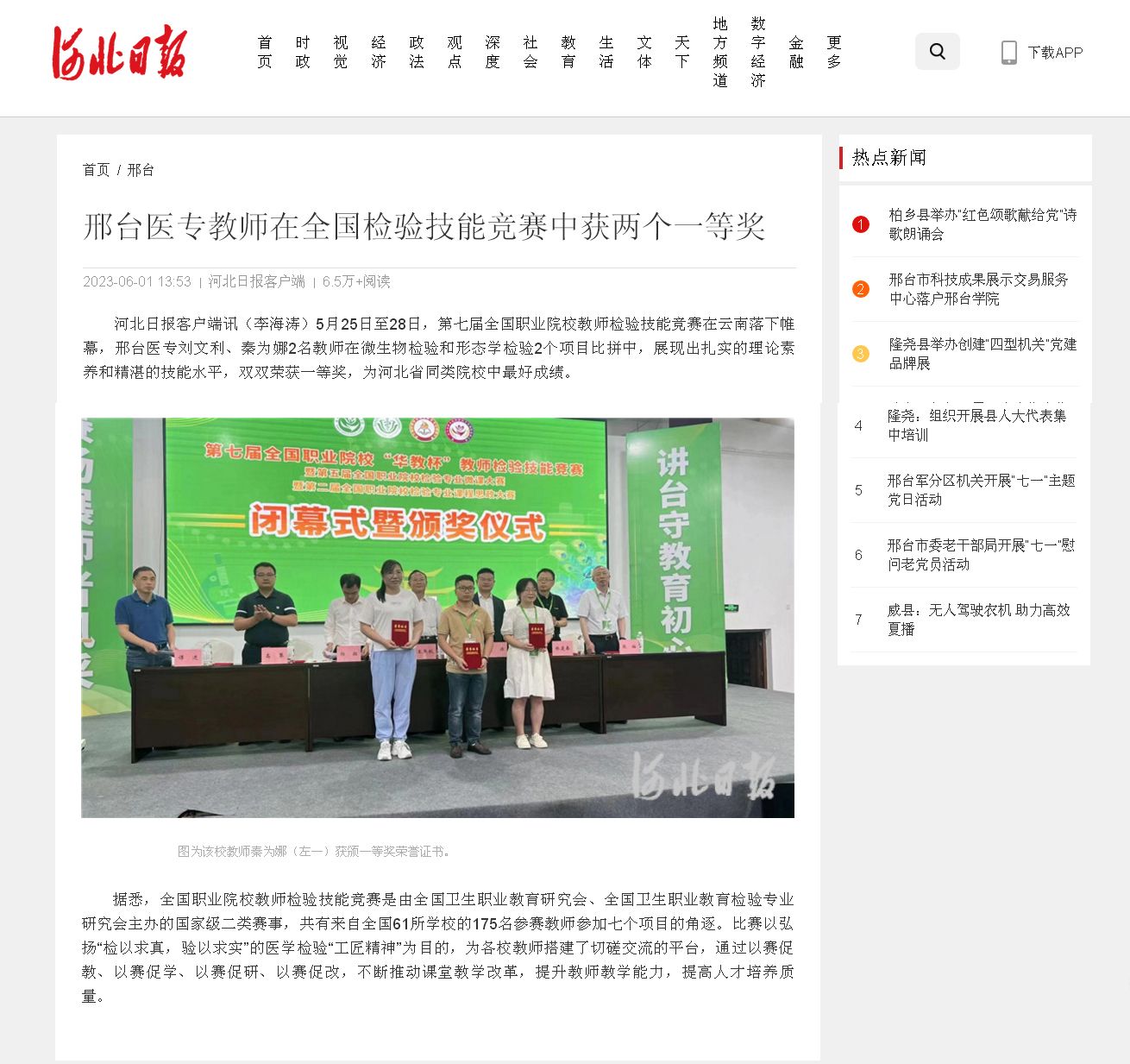 河北日报客户端报道:邢台医专教师在全国检验技能竞赛中获两个一等奖