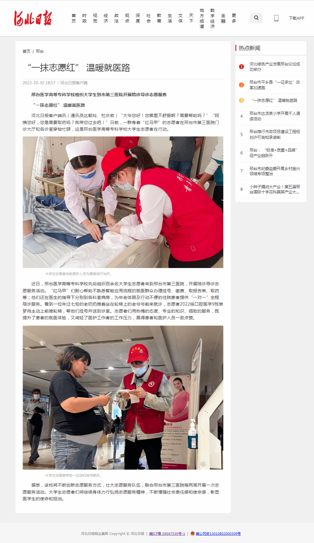 河北日报客户端讯(通讯员达朝玲、杜庆岩)“大爷您好!您哪里不舒服啊?需要帮助吗?”“阿姨您好,您是需要取药吗?我带您过去吧!”日前,一群身着“红马甲”的志愿者在邢台市第三医院门诊大厅和各诊室穿梭忙碌,这是邢台医学高等专科学校大学生志愿者在行动。