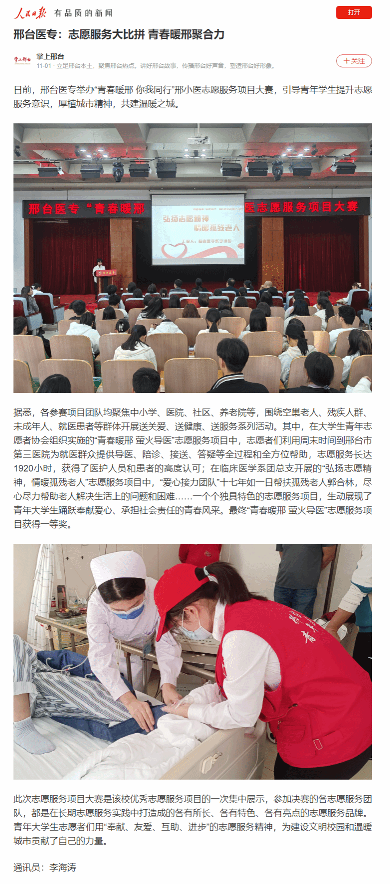 人民日报客户端:“邢台医专:志愿服务大比拼 青春暖邢聚合力”