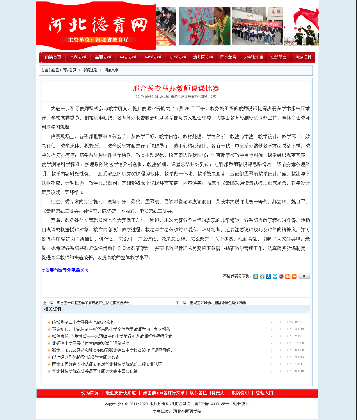 上一条:河北教育网报道“邢台医学高等专科学校第十六届大学生文化艺术节开幕”