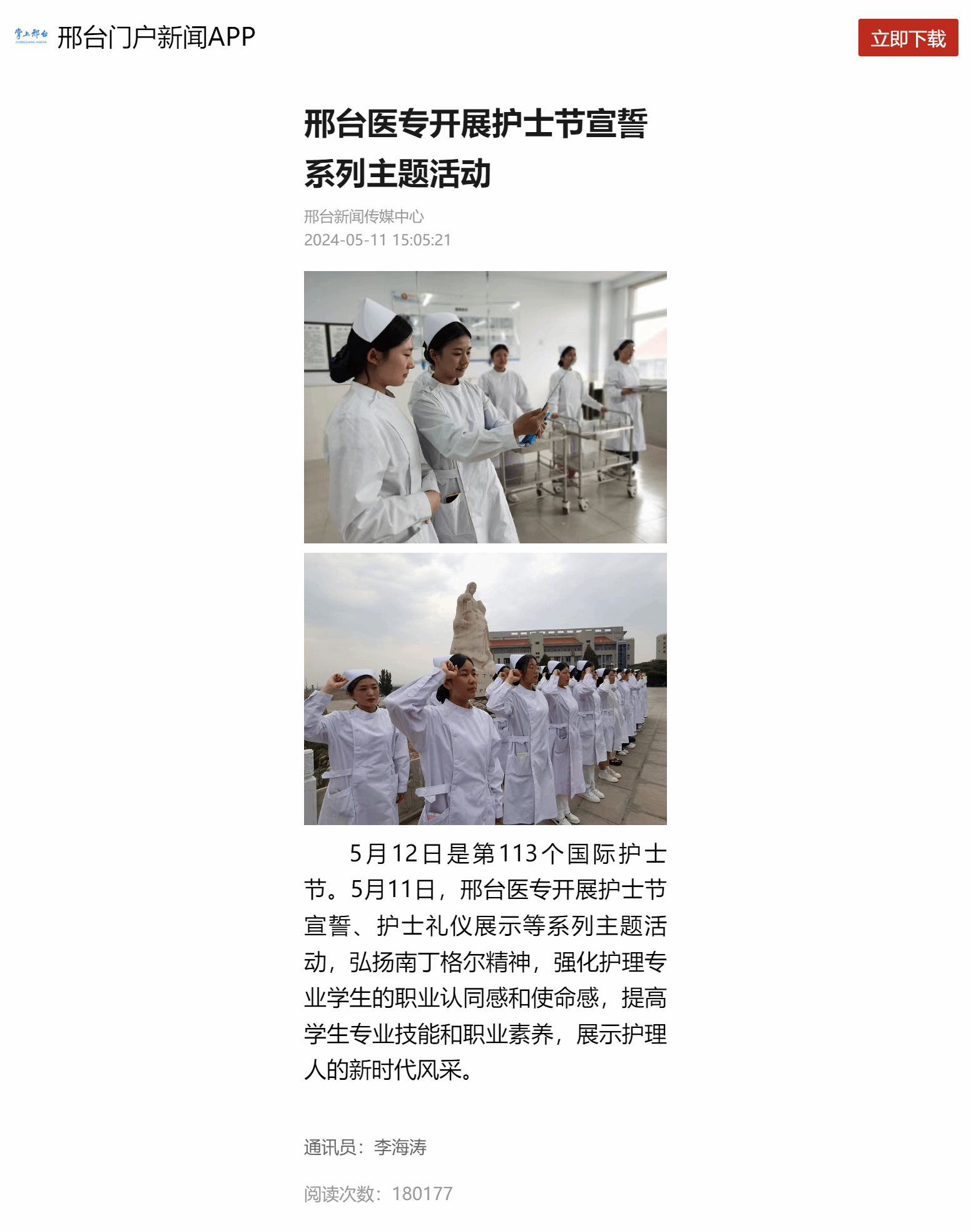 5月12日是第113个国际护士节。5月11日,邢台医专开展护士节宣誓、护士礼仪展示等系列主题活动,弘扬南丁格尔精神,强化护理专业学生的职业认同感和使命感,提高学生专业技能和职业素养,展示护理人的新时代风采。