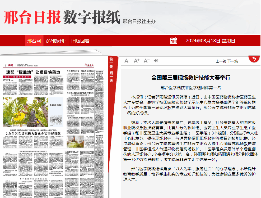 据悉,本次大赛是覆盖面最广、参赛选手最多、社会影响最大的国家级职业院校急救技能赛事。比赛共分为教师组、医药卫生大类专业学生组(医学组)和非医药卫生大类专业学生组(非医学组)3个组别,分别进行单人徒手心肺复苏、烫伤现场救护、气道异物梗阻现场救护等项目的技能比拼。经过激烈角逐,beat365平台唯一官网参赛选手在非医学组双人徒手心肺复苏现场救护与管理、非医学组成人气道异物梗阻现场救护、非医学组突发意外单个危重创伤病人现场救护3个赛项中分获第一名,孙丽娜老师和杨丽娟老师分别获团体第一名优秀指导教师,该学院获非医学组团体第一名。
