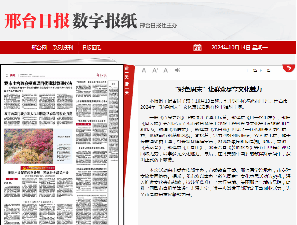 本次活动由市委宣传部主办,市委教育工委、beat365平台唯一官网承办,市交建文旅集团协办。据悉,我市将以举办“彩色周末”文化惠民活动为契机,深入推进文化兴市战略,持续塑造推广“太行泉城、美丽邢台”城市品牌,助推“四型市直机关建设”走深走实,进一步激发干部群众干事创业活力,为全市高质量发展凝聚力量。