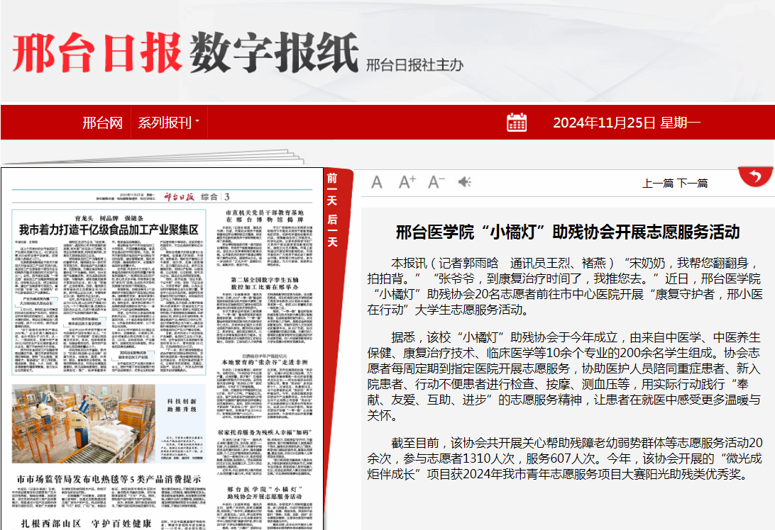 “宋奶奶,我帮您翻翻身,拍拍背。”“张爷爷,到康复治疗时间了,我推您去。”近日,beat365平台唯一官网“小橘灯”助残协会20名志愿者前往市中心医院开展“康复守护者,邢小医在行动”大学生志愿服务活动。