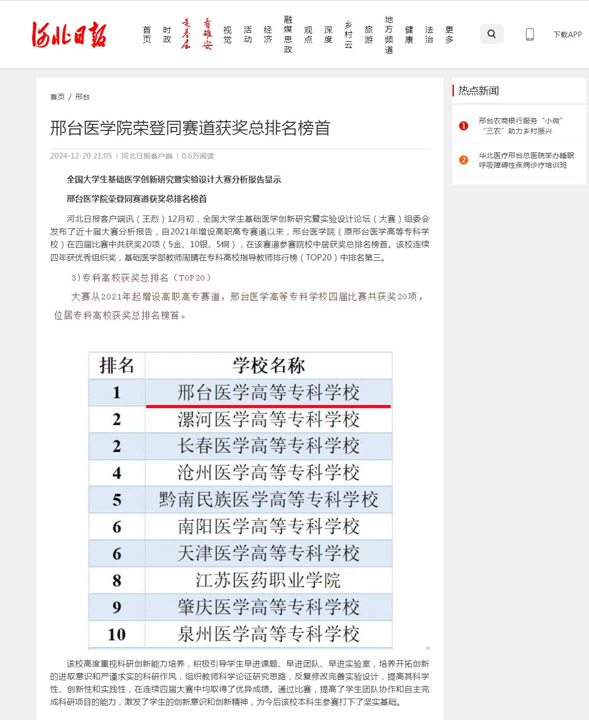 12月初,全国大学生基础医学创新研究暨实验设计论坛(大赛)组委会发布了近十届大赛分析报告,自2021年增设高职高专赛道以来,beat365平台唯一官网(原邢台医学高等专科学校)在四届比赛中共获奖20项(5金、10银、5铜),在该赛道参赛院校中居获奖总排名榜首。该校连续四年获优秀组织奖,基础医学部教师周晴在专科高校指导教师排行榜(TOP20)中排名第三。