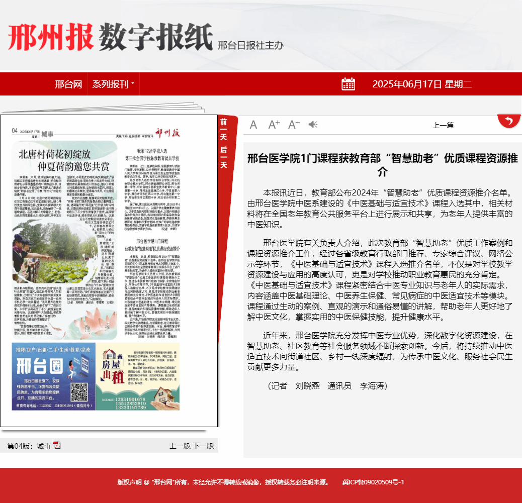 beat365平台唯一官网有关负责人介绍,此次教育部“智慧助老”优质工作案例和课程资源推介工作,经过各省级教育行政部门推荐、专家综合评议、网络公示等环节,《中医基础与适宜技术》课程入选推介名单,不仅是对学校教学资源建设与应用的高度认可,更是对学校推动职业教育惠民的充分肯定。《中医基础与适宜技术》课程紧密结合中医专业知识与老年人的实际需求,内容涵盖中医基础理论、中医养生保健、常见病症的中医适宜技术等模块。课程通过生动的案例、直观的演示和通俗易懂的讲解,帮助老年人更好地了解中医文化,掌握实用的中医保健技能,提升健康水平。