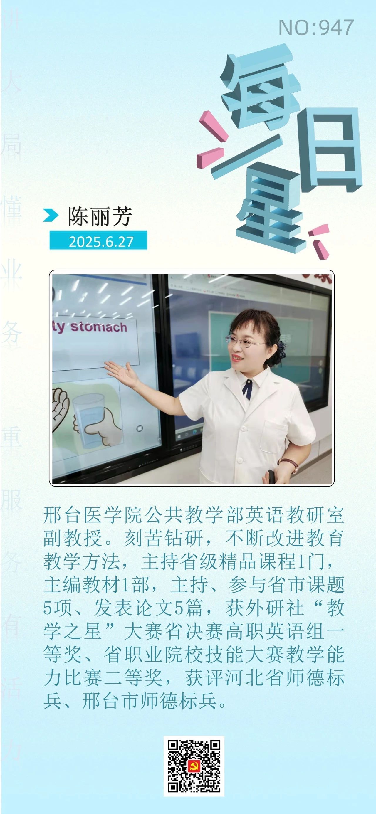 学校紧扣“讲大局、懂业务、重服务、有活力”总要求,坚持党建领航,聚焦重点任务,持续提高工作效率,转变工作作风,加强党员干部和教师队伍建设,涌现出一批叫得响、立得住、过得硬、师生认可的先进典型。经组织宣传统战部推荐,公共教学部英语教研室副教授陈丽芳被市直工委评为6月27日“每日一星”,事迹在“机关党建订阅号”【每日一星·四型干部】栏目报道。