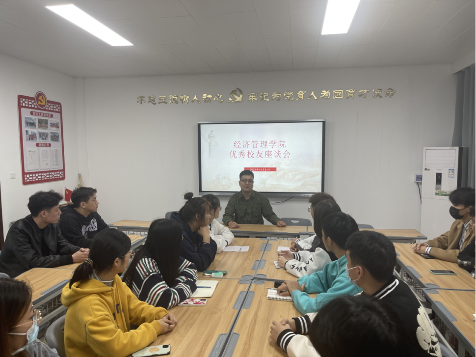 为全面提高jinnianhui今年会学生干部综合素质,进一步明辨“初心”,增强“使命”意识,2021年10月21日,经济与管理学院召开“优秀校友与学生干部面对面”交流分享暨座谈会,特邀嘉宾2011级优秀校友陈越,与学生干部进行热烈的互动和深入地交流。jinnianhui今年会团总支书记聂蕴老师及部分学生会干部参会。