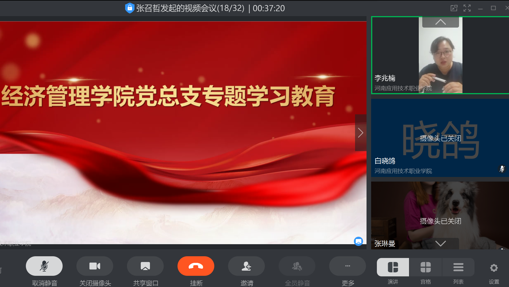 最后,李兆楠书记总结发言:我们要以高度的政治责任感和强烈的使命感学习习近平总书记系列重要讲话精神,深入研究贯彻落实各项措施,开展好党史学习教育,持续开展“为师生办实事”实践活动,结合近期的防汛、防疫工作,教育引导师生增强对中国特色社会主义的信念,增强对实现中华民族伟大复兴的信心。同时,我们要把习近平总书记重要讲话精神与学校学院的中心工作结合起来,齐心协力,以钉钉子的精神推进学校教育教学水平的提升。最后,面对当前洪涝、疫情等突发事件,全体党员要主动担当作为,身体力行,营造心往一处想、劲往一处使、拧成一股绳的良好氛围。