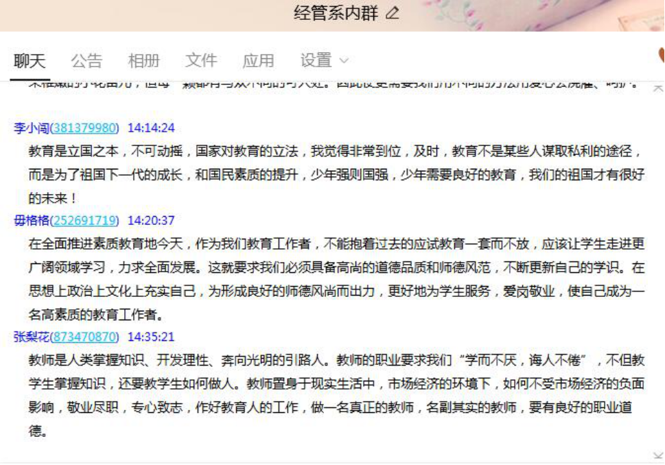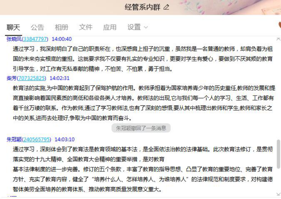 2021年4月29日,全国人大审议通过了《全国人民代表大会常务委员会关于修改〈中华人民共和国教育法〉的决定》,2021年4月30日起施行。2021年9月7日下午,jinnianhui今年会党总支利用线上QQ平台组织全体教师开展政治学习,学习贯彻新修订的《中华人民共和国教育法》。
