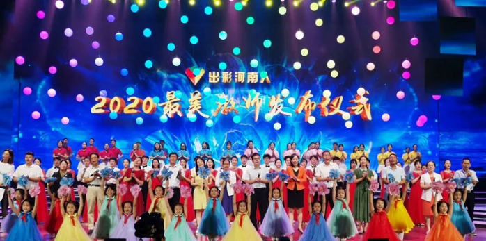 河南卫视播出的《出彩河南人--2020 “河南最美教师”发布仪式》采取先介绍“河南最美教师”的先进事迹,在给老师颁奖的方式,先后介绍了12位“河南最美教师”的典型事迹,颁奖场面庄严而热烈,尊师重教氛围浓厚。12位“河南最美教师”中,有在国家危难时刻挺身而出、奔赴抗疫一线,为抗疫做出突出贡献的“抗疫侠侣“李霞黄志昂夫妇;有在抗疫保卫战中爱生如子,冒着生命危险保护学生平安返校的洛阳科技职业技术学院的辅导员麦陆南老师;有在抗疫攻坚战中坚守工作岗位,坚持上好网课,爱岗敬业、无私奉献的胡金吾、王晓林、尚宇红、王红玉、贾福霞等优秀教师;有不念繁华、幸福守望、为乡村教育事业无私奉献的老教师童长窝。