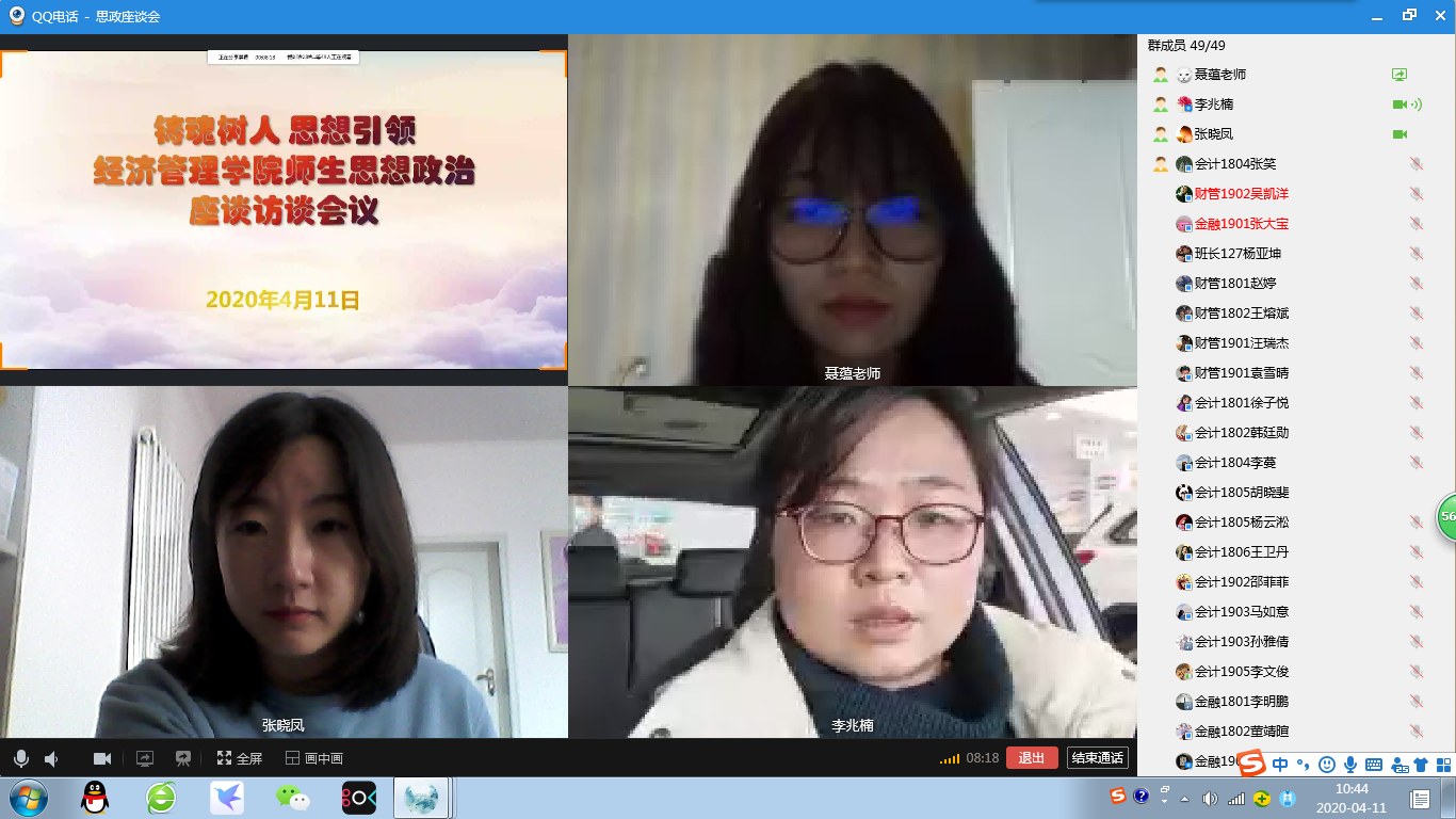 同学们各抒己见,围绕社会热点问题、国际局势问题、学习工作问题、思想政治教育及相关活动的开展等十个方面的话题展开了热烈的讨论,自由发表了自己的观点。如注会1802班李亚梦说:通过这次疫情,我深切的感受到了我们国家各级党组织和广大党员干部不忘初心、牢记使命,扛起责任、经受考验,在这场大考中磨砺责任担当之勇、科学防控之智、统筹兼顾之谋、组织实施之能,做到守土有方、守土有责。把疫情当敌情、把病房当战场、把群众当亲人,彰显了“不怕牺牲、勇于担当、顾全大局、甘于奉献”的鲜明品格,践行了“人民利益高于一切”的初心使命,展现了新时代共产党员的崇高形象。疫情的防控及时,民众的防范意识强,齐心协力的努力,我为自己生在中华家,备感骄傲!会计1903班马如意同学说:青少年是国家的未来、民族的希望,能否抓好青少年的意识形态工作,关系社会的发展方向。我们党立志于中华民族千秋伟业,必须培养一代又一代拥护中国共产党领导和我国社会主义制度、立志为中国特色社会主义事业奋斗终身的有用人才。这就要求我们把下一代教育好、培养好,从学校抓起、从青少年抓起。当前,中国特色社会主义进入新时代,中国人民对国家的未来充满信心,我们作为新时代青年人的民族自豪感、时代责任感、历史使命感持续增强。我们要始终坚持马克思主义指导地位,深入学习贯彻习近平新时代中国特色社会主义思想,坚持党的领导,让党的事业更加兴旺,让中华民族的百年梦想成为光辉现实。