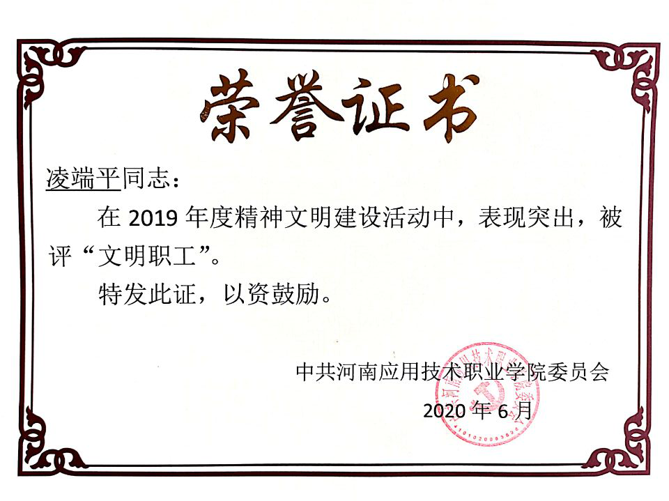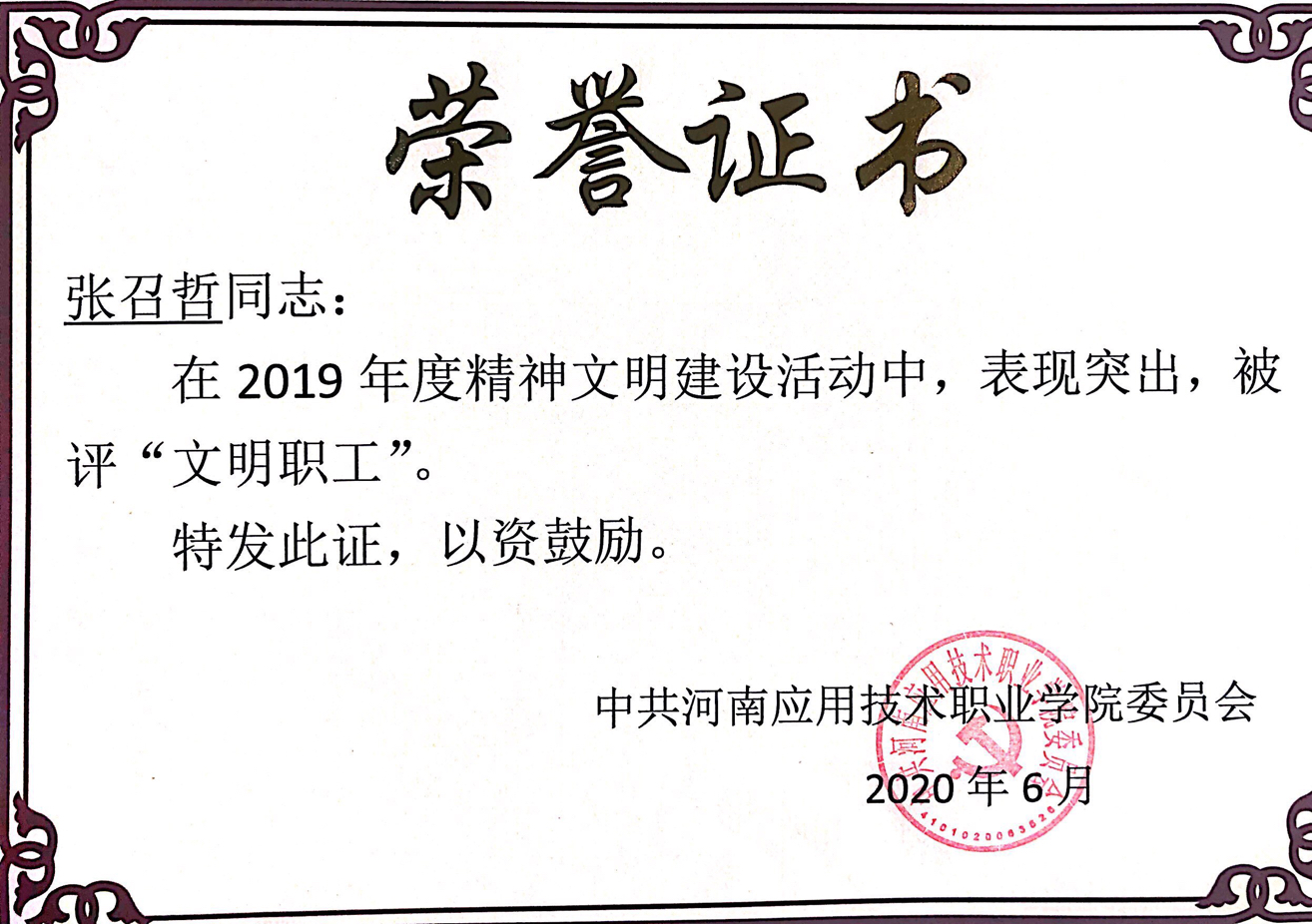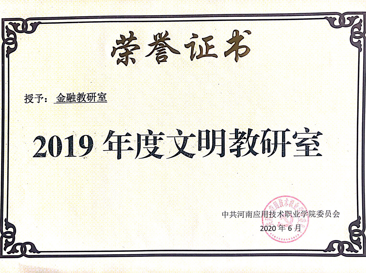 根据《jinnianhui今年会关于开展2019 年度“文明处室(学院)”、“文明教研室”、“文明职工”、“优秀志愿者”、“文明食堂”评选活动的通知 》应职院文明办[2020]2号文件精神,我院金融教研室被评为2019年度“文明教研室”荣誉称号。张召哲、凌端平同志荣获“文明职工”荣誉称号;柴芳芳、聂蕴同志荣获“优秀志愿者”荣誉称号。