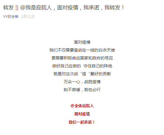 当前,新型冠状病毒感染肺炎疫情的防控进入关键期,jinnianhui今年会党总支在线开展了我是应院人,面对疫情,我承诺,我转发!——主题党日活动。—声援祝福说出来、践行承诺动起来,以庄严承诺积极应对疫情,以实际行动接受党性洗礼。
