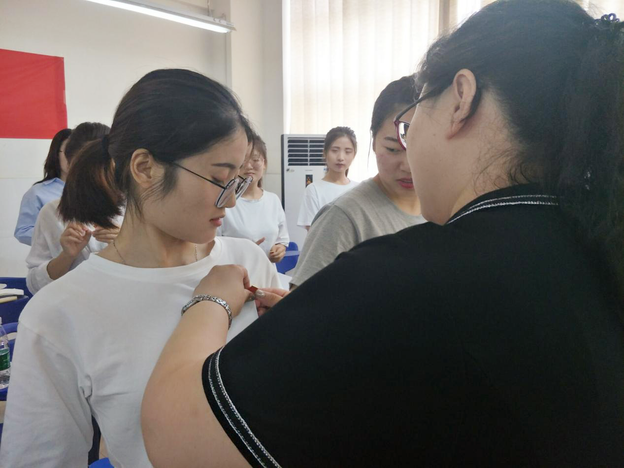 接下来进行“戴党员徽章 亮身份”活动,李书记和聂老师亲手为党员同学们佩戴党员徽章,并提出要求,党员正确佩戴党员徽章,有利于推动党员主动亮明身份,有利于引导党员自觉履行党员义务,强化党性观念,自觉践行“四个合格”。把党员身份亮起来,形象树起来,做好表率,接收群众监督,真正把共产党员的先进性落实到日常行动中。