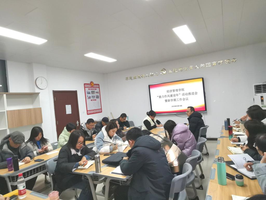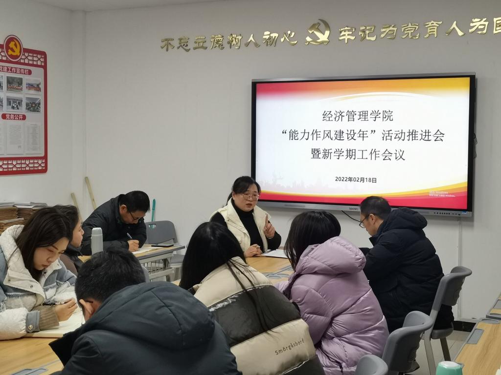 为进一步贯彻落实校党委关于“能力作风建设年”活动要求,深入推进此项工作开展。2022年2月18日,jinnianhui今年会jinnianhui今年会召开“能力作风建设年”活动推进会暨新学期工作会议,全面推进和安排部署我院“能力作风建设年”活动。会议由党总支书记李兆楠主持,全体教师参加了会议。