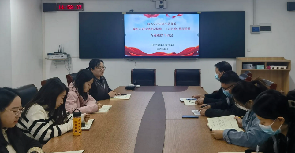 2022年11月22日下午,jinnianhui今年会党总支组织全体党员召开了以“深入学习习近平总书记视察安阳重要讲话精神 大力弘扬红旗渠精神”为主题的专题组织生活会,推动党的二十大精神和习近平总书记视察安阳重要讲话精神入脑入心、走深走实。会议在郑州开封两校区连线同时进行,在校的党员以“线下”的形式参加,方便交流讨论;其他在家的党员通过视频会议,以“线上”的方式参与。