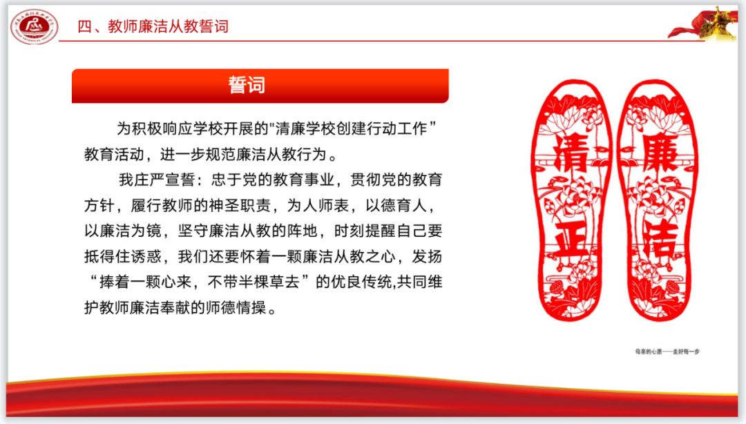 会上,围绕“廉洁从教”主题,张召哲从涵义要点、重要意义、建设途径、廉洁誓词四个方面进行阐述。他指出,廉洁从教包含思想上廉洁自律、管理上廉洁奉公、科研上严谨治学、服务上实事求是四个层面。他强调,廉洁从教是立业之本、立校之根,要从校园文化、教风学风、体制机制三个层面扎实推进职业院校廉洁从教建设。期间,张召哲带领全体教师郑重宣读廉洁从教誓词。