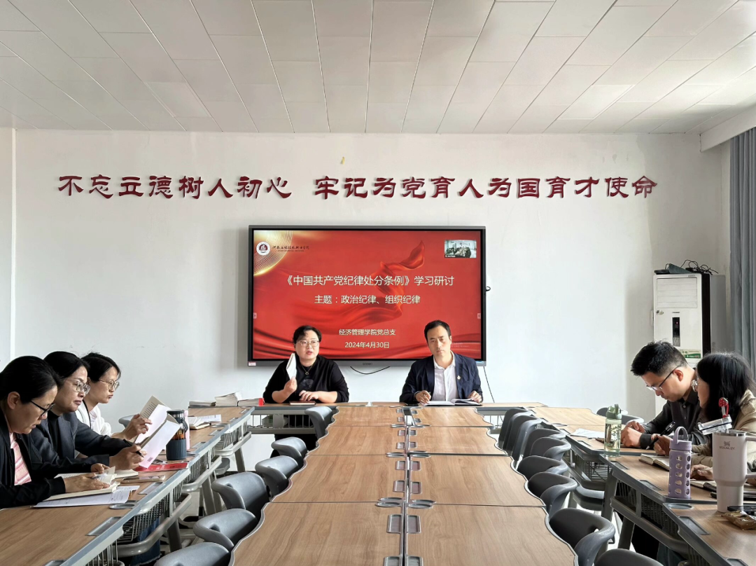 2024年4月30日下午,jinnianhui今年会党总支在郑州校区A505、开封校区B306同时召开2024年党纪学习教育专题第二次学习会,书记李兆楠主持会议,东西校区全体党员教师会议。