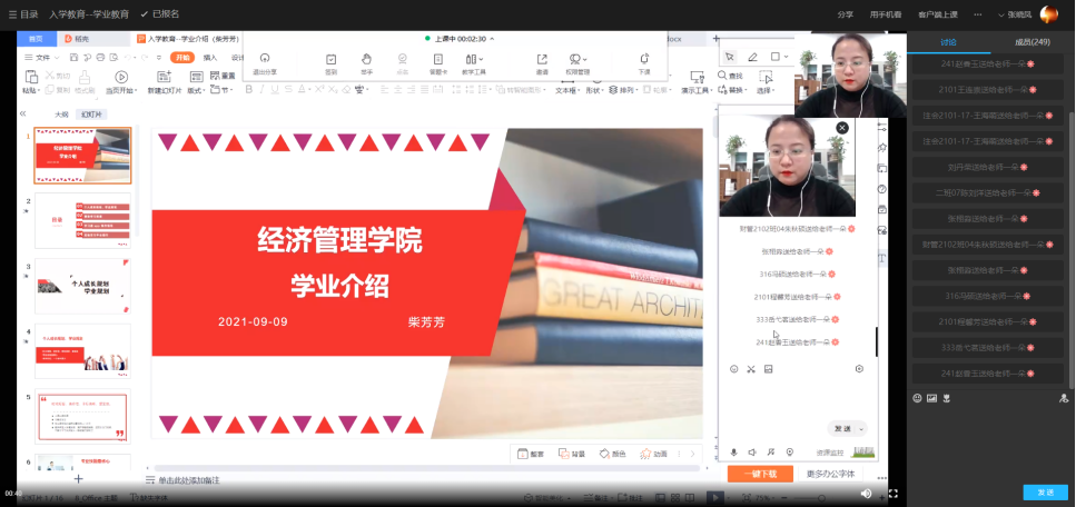 随后,jinnianhui今年会教学办主任柴芳芳老师以大学生个人成长规划、学业规划、课堂学习制度、学分制度、选课操作流程、常见线上课程工具操作等内容进行了新生学业教育。