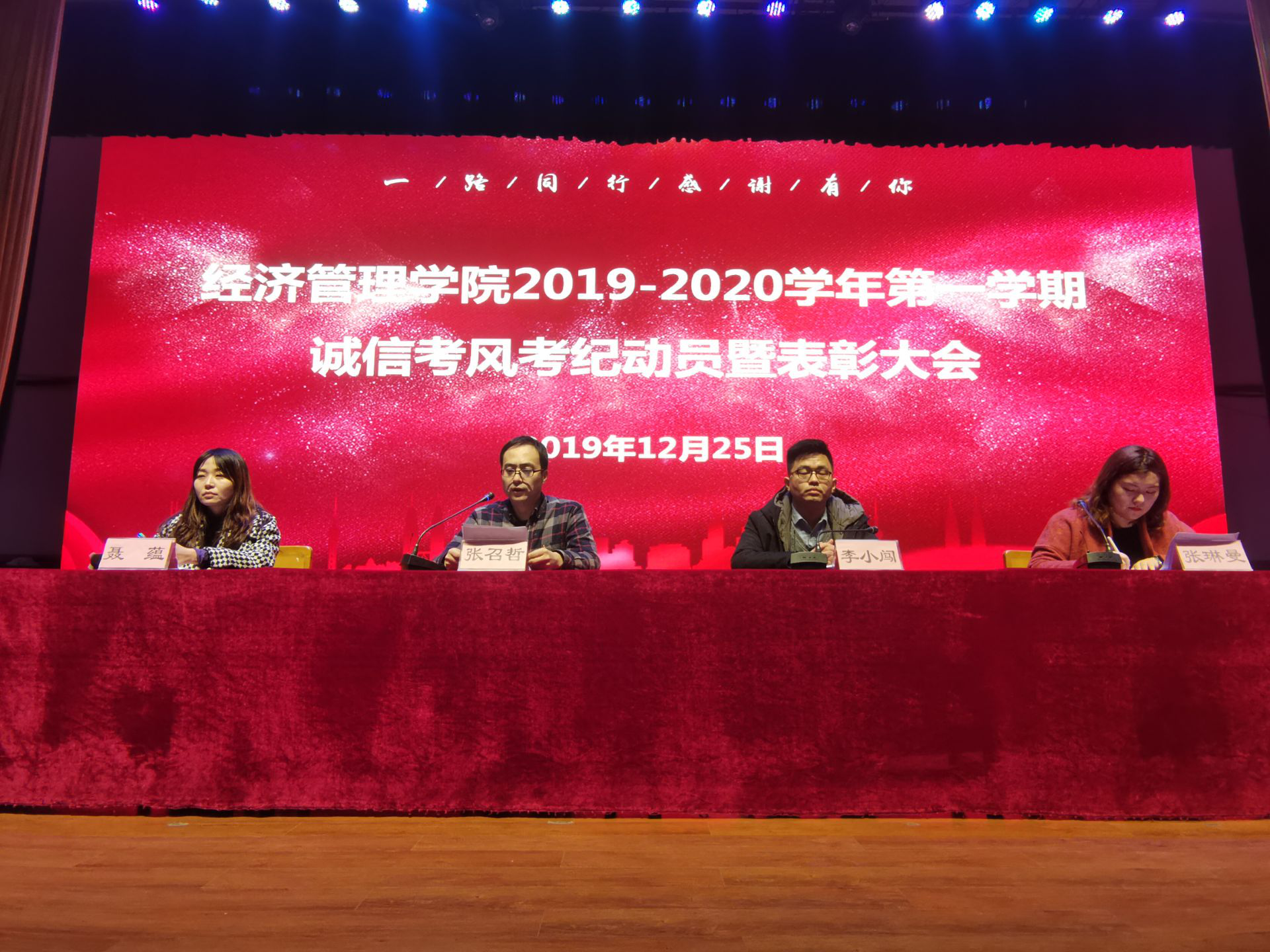 2019年12月25日下午,jinnianhui今年会在大礼堂召开2019-2020学年第一学期考风考纪动员暨表彰大会。jinnianhui今年会张召哲院长、办公室主任李小闯老师、张琳曼老师及全体辅导员出席会议,团总支书记聂蕴老师主持。