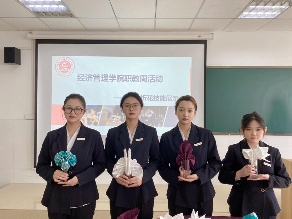 jinnianhui今年会职教活动周之餐巾折花技能展示于2022年5月11日举行,餐巾花造型美观、生动形象,选手们动作娴熟、妙手生花,展示了扎实的基本功。大赛充分展示了经管学子扎实的专业知识、熟练的操作技能和精益求精的专业精神。