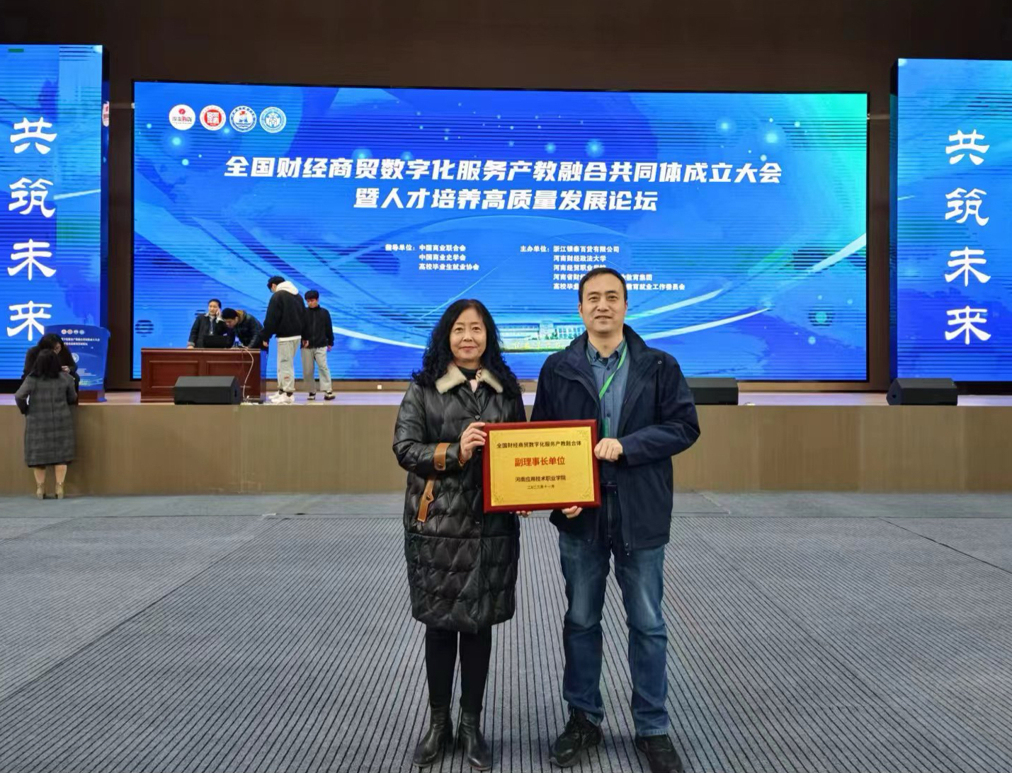11月25日,全国财经商贸数字化服务产教融合共同体成立大会暨人才培养高质量发展论坛在河南经贸职业学院大学生活动中心举行。来自省内外的兄弟院校代表、企业代表、行业组织和科研机构代表共150多家单位,400余人参加了大会。学校校企合作与就业处处长马春燕、jinnianhui今年会院长张召哲作为副理事长单位代表受邀参加大会。