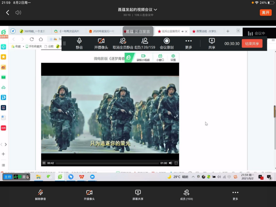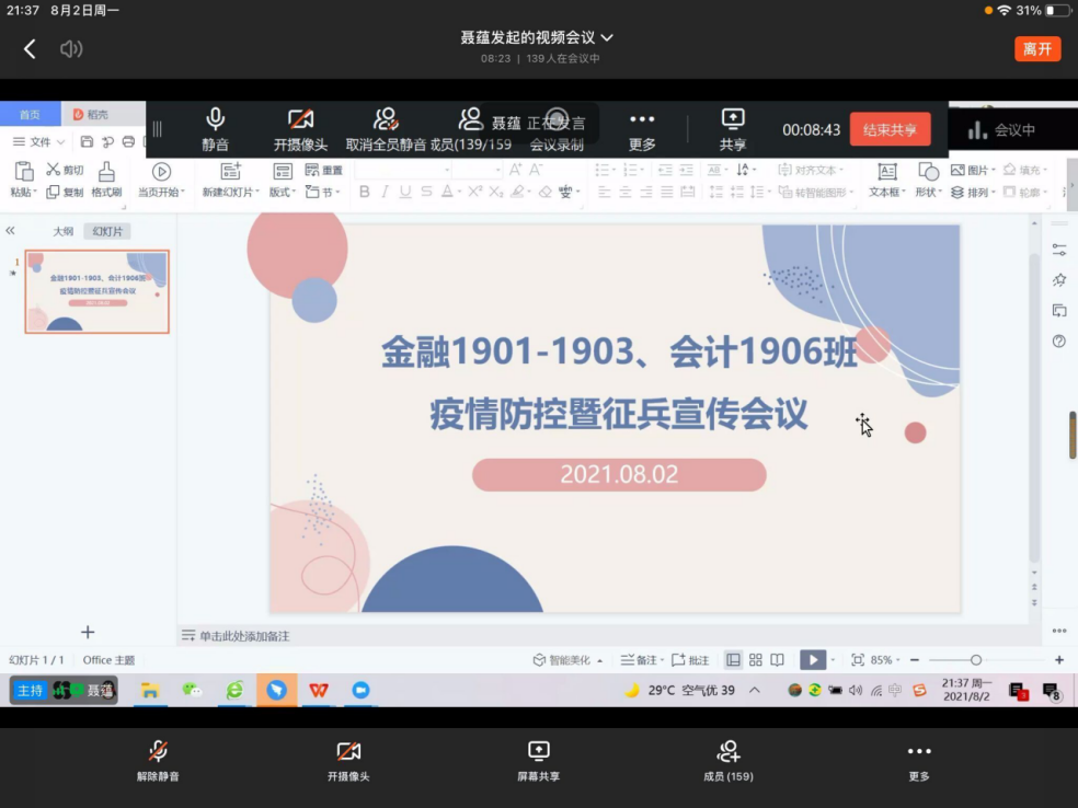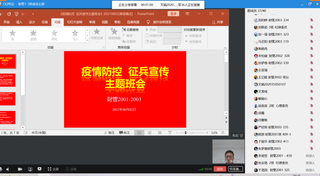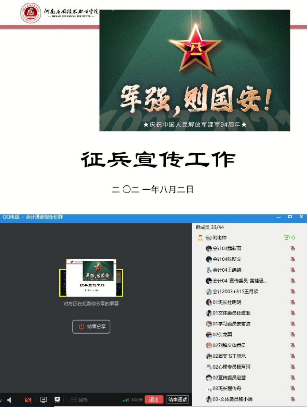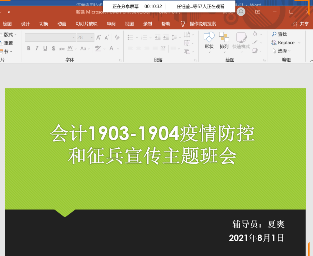 基于当前新冠肺炎疫情形势变化复杂,为进一步落实学校疫情防控工作要求,持续加强大学生思想政治教育,帮助同学们顺利度过一个充实、愉快、安全的假期,jinnianhui今年会19级、20级全体班主任、辅导员于8月1日、2日两天,组织各班召开了线上疫情防控暨征兵宣传主题班会。