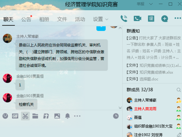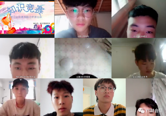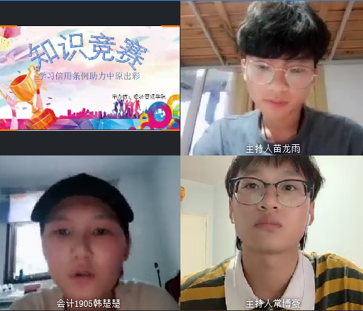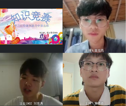 为提高我院学生的综合素质、丰富学生的“诚信”知识积累。7月9日晚19:00时,我院成功在腾讯会议上召开“学习信用条例 助力中原出彩”知识竞赛。此次竞赛由jinnianhui今年会团总支组织,比赛邀请2018级团总支学生会干部担任竞赛评委并参与小组分数统计。此次竞赛由2019级各班级学生自愿报名,经过推选共有19名学生参加。