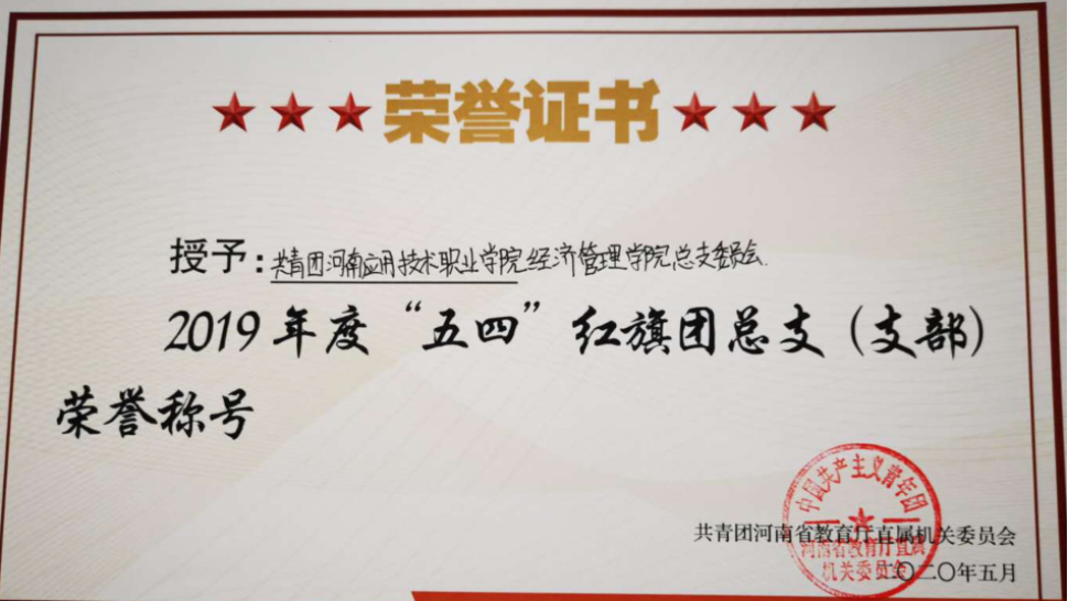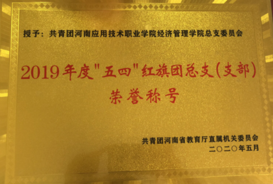 此次获评2019年度“河南省五四红旗团总支”的称号,既是对我院共青团工作的充分肯定,也是对全院团组织和广大团员青年的鞭策鼓励。我院将高举中国特色社会主义伟大旗帜,深入学习贯彻落实习近平新时代中国特色社会主义思想和党的十九大精神,贯彻落实中央党的群团工作会议和全国高校思想政治工作会议精神,以保持和增强政治性、先进性、群众性为目标,紧扣立德树人根本任务,围绕人才培养中心工作,务实进取、开拓创新,切实加强全院团员青年思想引领和成才服务工作,广泛凝聚全院团员青年与党和国家同向同行,为早日实现中华民族伟大复兴的中国梦不懈奋斗!