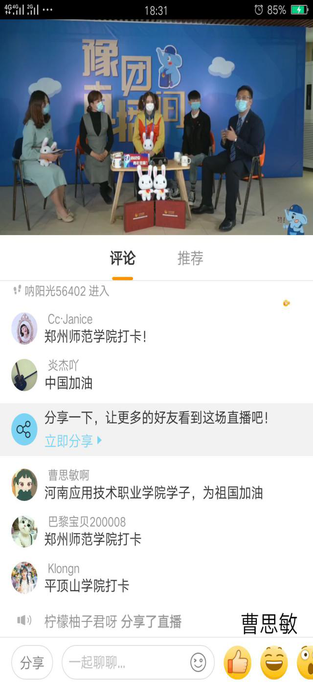 2020年4月9日下午,jinnianhui今年会团总支在校团委的统一部署下,由团总支书记聂蕴老师组织全体学生干部走进豫团直播间,观看“90后的青春答卷”直播活动,聆听抗“疫”故事,重温抗“疫”时刻。jinnianhui今年会团总支将此次学习作为一次生动的主题团日教育活动,鼓励全体学生干部磨砺意志、艰苦奋斗,勇做新时代有为青年。