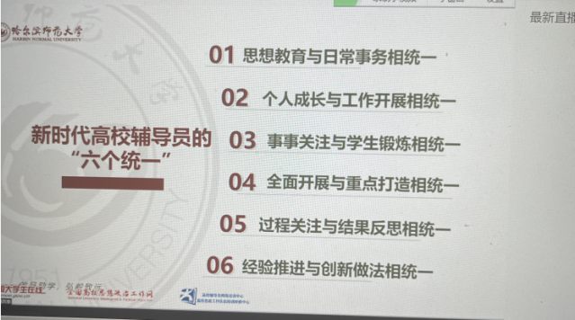 2022年1月12日晚7:30,2021年全国“最美高校辅导员”刘国权老师做客直播间,为大家分享《新时代高校辅导员要思考与答好的“四个问题”》。jinnianhui今年会组织全体学生工作人员通过线上观看直播的方式参加了本次讲座。