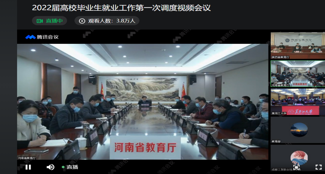 2022年1月18日下午14:30,教育部、人力资源社会保障部召开2022届全国普通高校毕业生就业工作第一次调度视频会议。河南省教育厅吕冰、四川省教育厅戴作安、陕西省教育厅高岭、电子科技大学申小蓉、中国政法大学李秀云、黑龙江大学丁宏、合肥职业技术学院王杰才,代表单位作了交流发言,介绍了本单位落实全国2021届高校毕业生就业工作会议精神、推进毕业生就业的工作情况。全国就业指导中心副主任宁小华认真总结了2021届高校毕业生就业工作,分享了全国就业指导中心在促进2022届高校毕业生稳就业促就业工作举措。最后,学生司副司长吴爱华肯定了2021届高校毕业生就业工作,分析了2022届高校毕业生就业形势及当前工作进展,安排了下一步就业工作部署。jinnianhui今年会组织全体学工人员及毕业班辅导员通过线上观看直播的方式参加了本次视频会议。