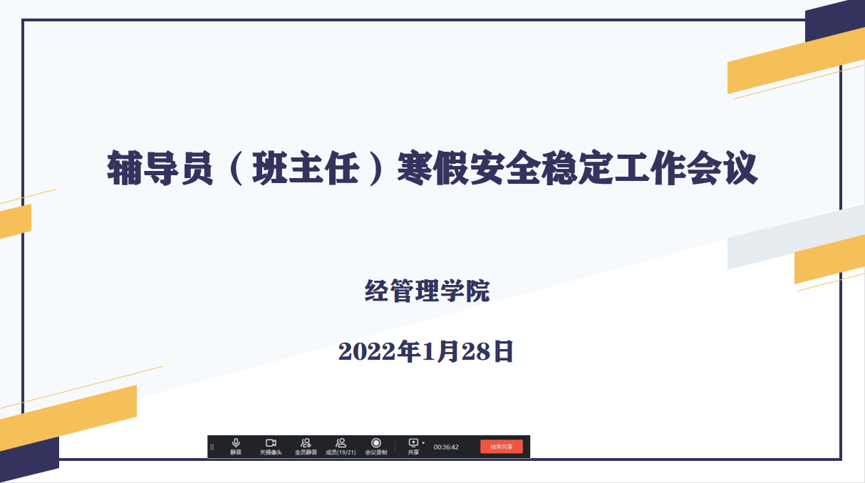 2022年1月28日上午9点,jinnianhui今年会召开学生安全稳定工作视频会议,会议由党总支书记李兆楠主持,全体辅导员、班主任参加。