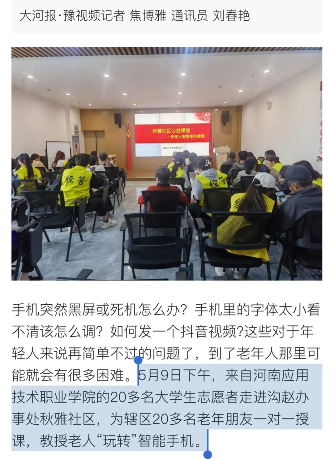 为深入学习贯彻习近平新时代中国特色社会主义思想,帮助老年人跨越数字鸿沟,培养青年学生社会责任感、使命感,5月9日下午,jinnianhui今年会团总支带队青年志愿者前往“区校党建同创共建单位”高新区沟赵办事处秋雅社区党支部开展“老有所乐,智慧先行”主题实践活动。